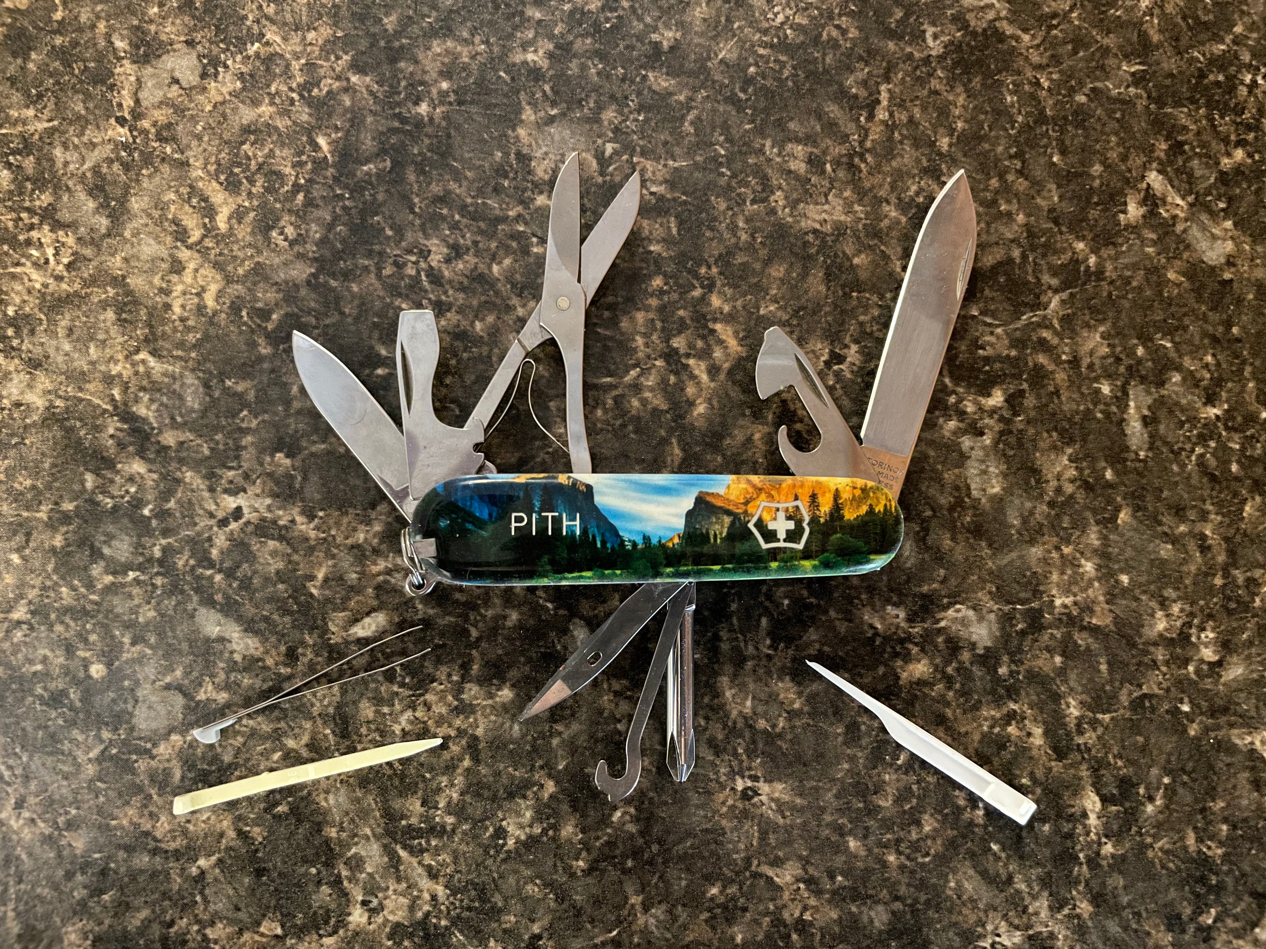 Because of the value I place on amazing modern multi-tools, like my knife, I decided to have some of them custom-made for all the contributors to my third book, Good Clean Fun, which is a really joyous woodworking textbook, and sort of memoir of my woodshop. I chose the killer vista of Yosemite National Park, and added the word PITH.